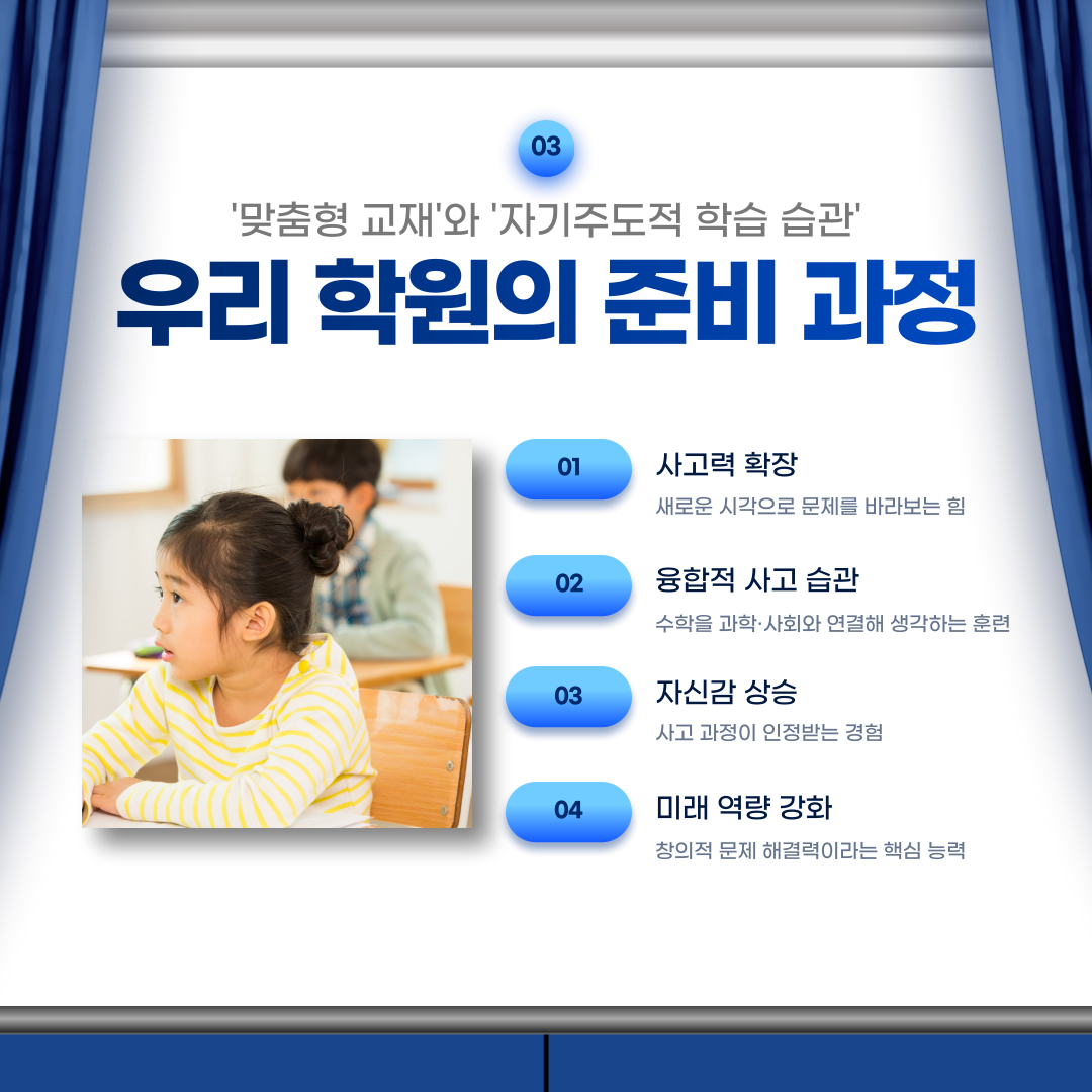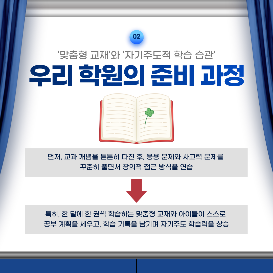 저희 학원은 맞춤형 교재 학습과 자기주도 학습 습관을 중심으로 꾸준하게 수학 실력을 길러나갔습니다.
