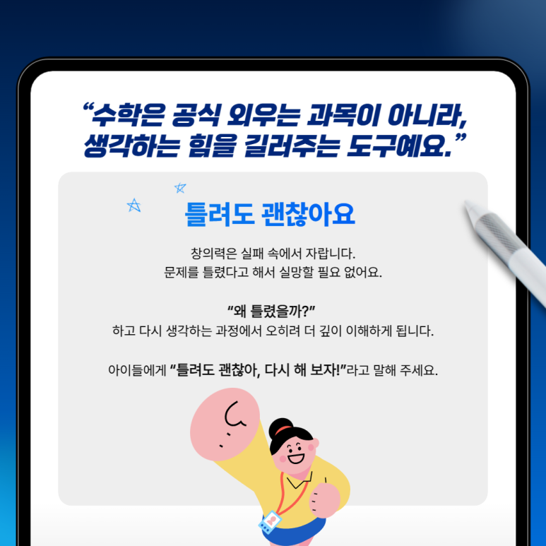 아이들에게 “틀려도 괜찮아, 다시 해 보자!”라고 말해 주세요.